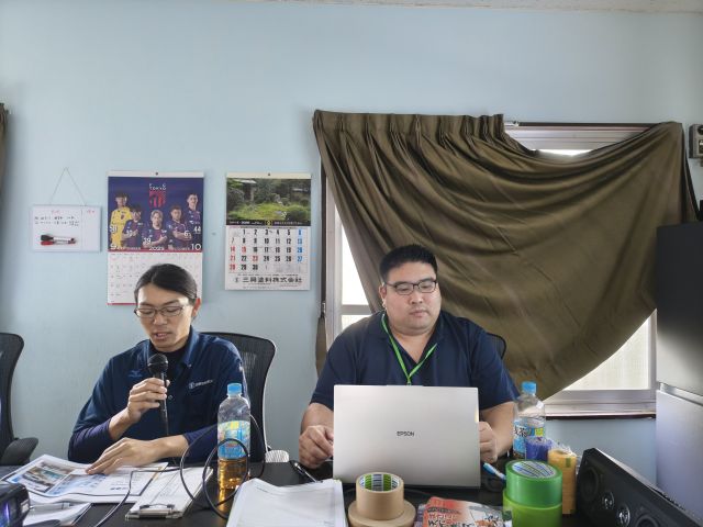本日のホスト、三興塗料の落合さん、赤地さんによるプレゼン開始。事前準備のレジュメを配布後、パワポで自社紹介。