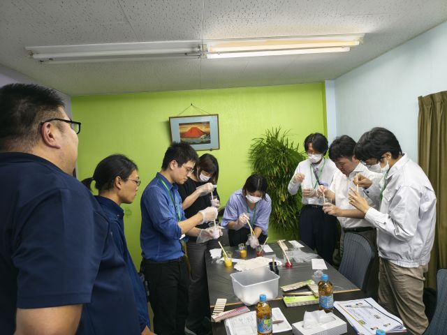 その後、三興塗料の強みの一つ、自社調色の体験会へ。